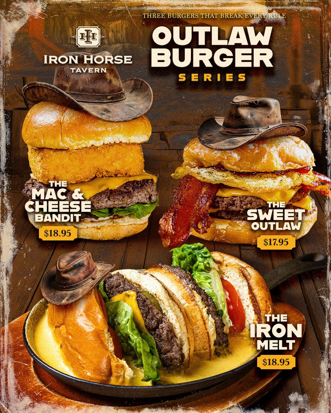these ain’t your average burgers—they’re outlaw legends stacked high and riding dirty. from cheesy bandits to bacon-slingin’ renegades, every bite breaks the rules.